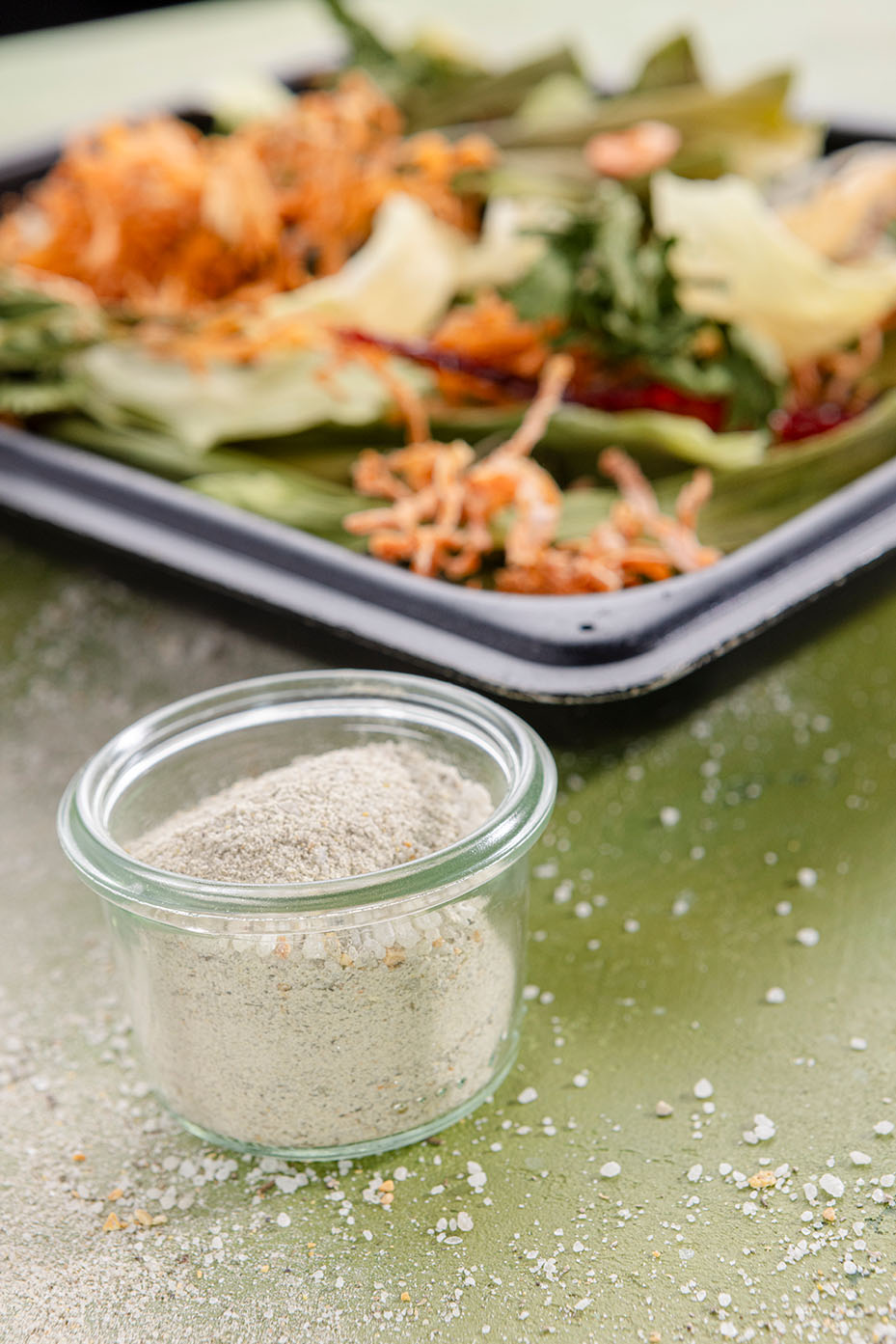 Versa il sale su una teglia U-Pan GN 1/2 alta 40mm. Se utilizzi una teglia GN1/1, raddoppia le dosi. Disponi tutti gli scarti sopra il sale.